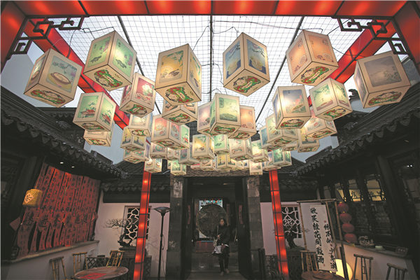 Woodblock prints in the nationally recognized Suzhou Taohuawu style are showcased at the Pingjiang cultural center in Suzhou. [Photo provided to China Daily]