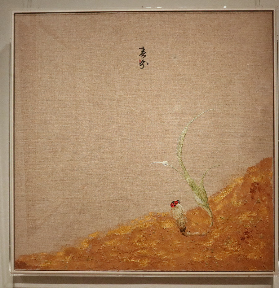 Another piece, which aims to raise public awareness of the environment, is Chun Fen (Spring Equinox), featuring real, cracked earth mounted on silk. Within the soil, she embedded clipped thread ends and gold dust. A single embroidered seed sprouts from the textured surface, accompanied by two tiny ladybugs — a tribute to agrarian life, renewal, and scientist Yuan Longping, known as the father of hybrid rice.