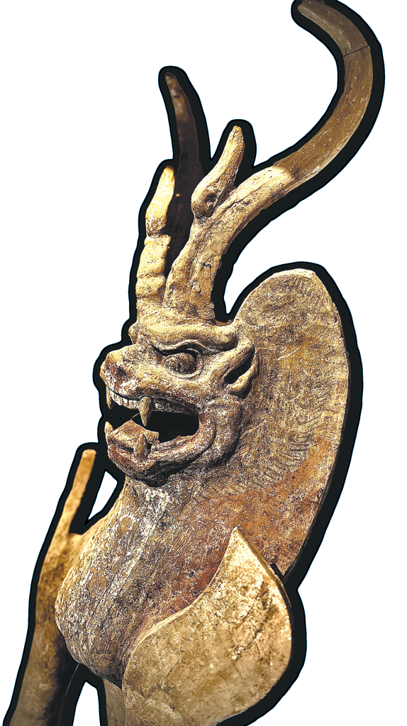 Physical expressions of such cultural concepts include exhibits of clay unicorns and bronze tortoises sculpted during the Wei (220-265) and Jin (265-420) dynasties, a Jin-era bone ruler and blocks engraved with such motifs as a tiger, a maidservant clasping a spoon and a manservant clutching a broom.